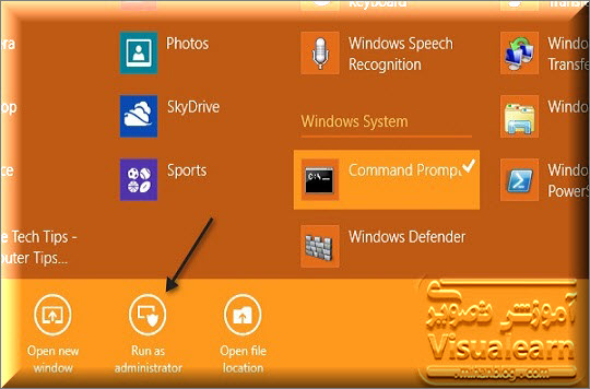 در این قسمت بر روی برنامه Command Prompt راست کلیک کنید سپس در پایین از بین گزینه های به نمایش در آمده بر روی Run as Administrator کلیک نمایید.