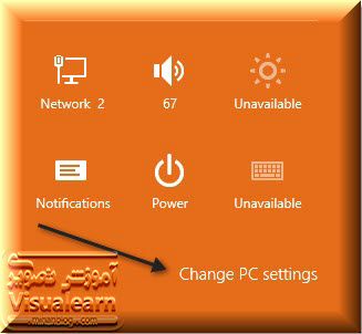 برای بازگردانی فایل پشتیبان از روی نوار Charms bar سپس تنظیمات Settings را انتخاب و در نهایت بر روی گزینه Change PC Settings کلیک نمایید.