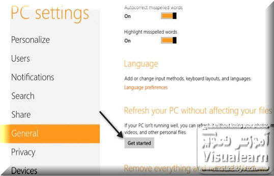 در منوی PC Settings از بین گرینه ها بر روی General کلیک کنید و از قسمت Refresh your PC گزینه Get Started را انتخاب نمایید.