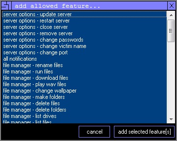 Password: اين گزينه براي حفاظت از Server استفاده می شود به طوري كه هیچ کسی نتواند به Server ي كه شما ايجاد كرده ايد متصل شود مزيت آن اين است كه اگر نفوذگر ديگري به Victim دست یابد بدون Password نتواند از Server شما استفاده كند. اگر شما فردی مبتدی هستید این کار لزومی
