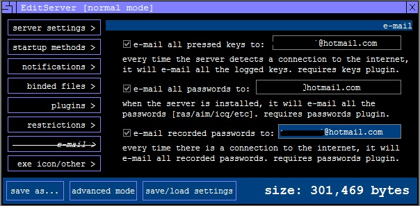 e-mail all pressed key to : اين گزينه Server را قادر می سازد كه ليست تمام كليدهاي فشرده شده را به آدرسe-mail شما در سايت hotmail بصورت يك e-mail فرستاد ، با وجوداينكه برای اجراي این قسمت key plugin لازم است.